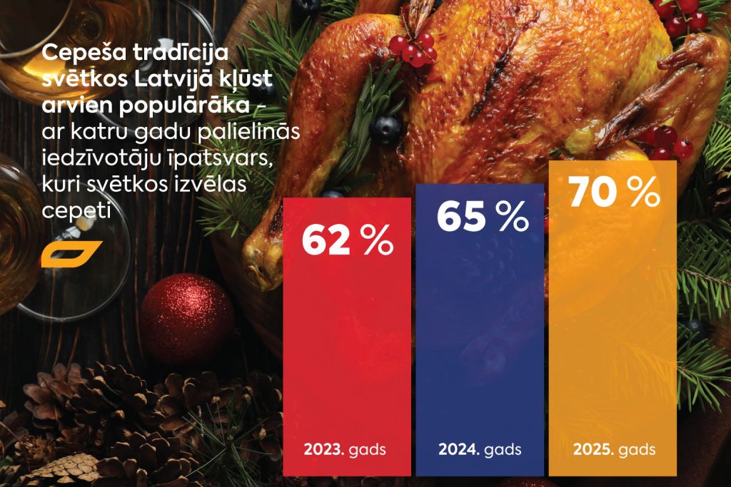Šogad cepetis būs neatņemama svētku maltītes sastāvdaļa lielākajā daļā mājsaimniecību – 70 % Latvijas iedzīvotāju svētku galdā plāno celt cepeti, liecina “Ķekava Foods” un “Norstat” veiktās aptaujas dati. Svētku cepešu popularitāte pēdējo trīs gadu laikā ir konsekventi pieaugusi – ja 2023. gadā cepeti svētkos izvēlējās 62 % iedzīvotāju, tad 2024. gadā tas jau bija uz galda 65 % Latvijas mājsaimniecību.