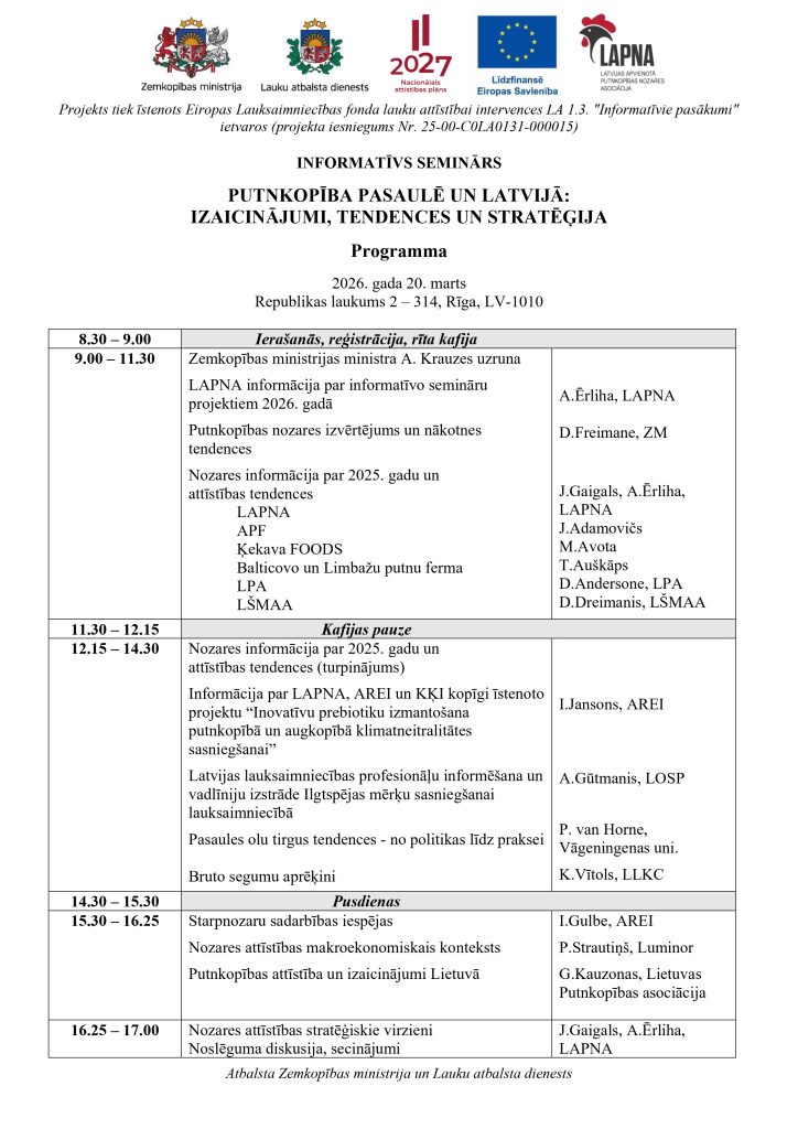 Seminārā apskatīsim līdz šim putnkopībā paveikto, lūkosim, kādas ir putnkopības attīstības tendences Latvijā un pasaulē, dzirdēsim par sadarbības iespējām un ekonomistu vērtējumus.