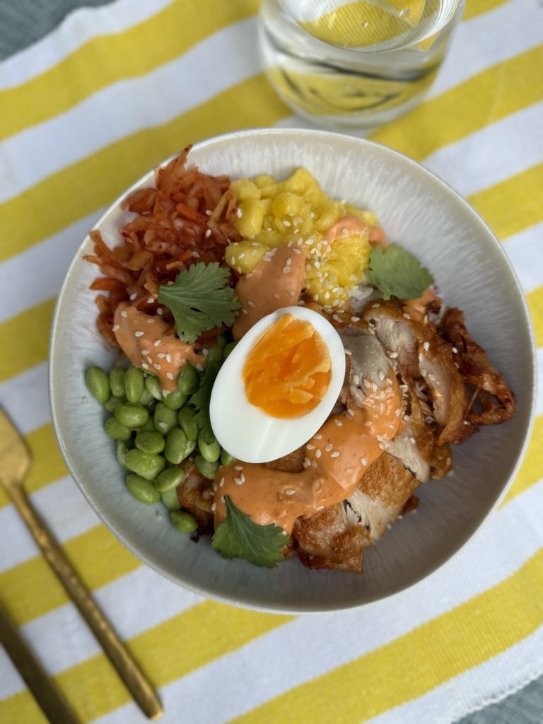 7. Bļodā liek rīsus, sagrieztu vistu, edamame pupiņas, kimči, mango un olu. Pievieno mērci, pārkaisa sezama sēklas un pārber ar koriandru. Video recepte poke bļodas pagatavošanas gaitai pieejama “Ķekava” mājaslapā.